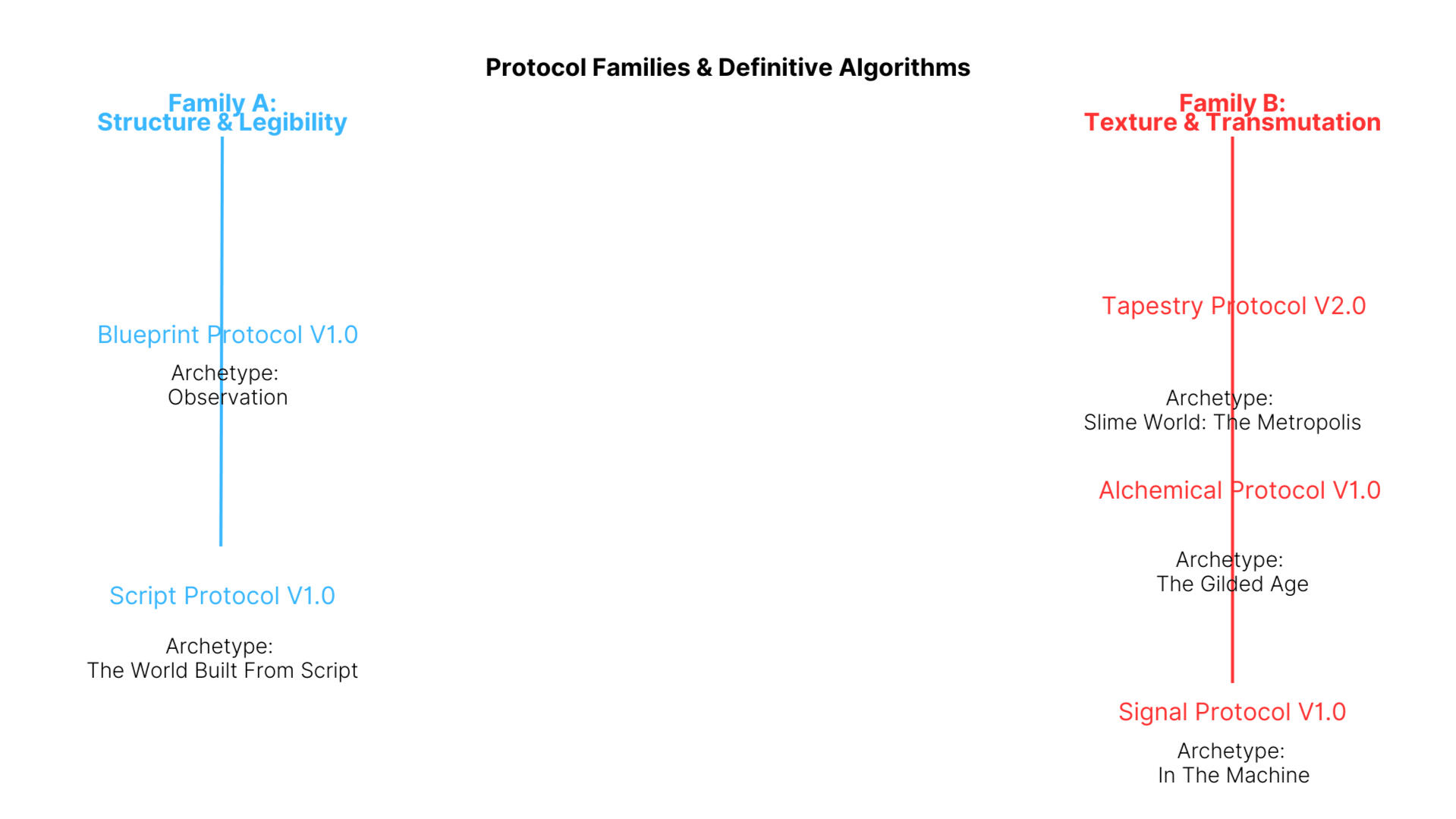The system is organized into two primary philosophical branches, or Protocol Families, which represent the core creative and intellectual tension of the project. Each family contains a series of distinct, codified algorithms known as Protocols.